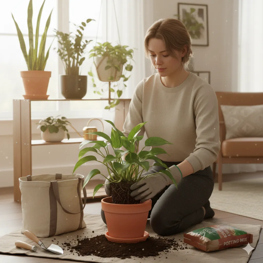 Vanlig blomsterjord fra butikken fungerer for mange planter. Viktig er at den er luftig og ikke holder for mye vann. Noen planter foretrekker en blanding med litt mer sand eller perlit. Ompottingsmodulen vår går gjennom valg av jord og potte steg for steg.